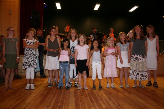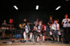 Austrheim Musikklag og skottane Scott, Amy og Struin spelar saman |