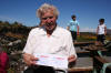 Kjellfrid held seg godt fast i veska si mens ho venta på at da skal bli hennars tur til å fyke |