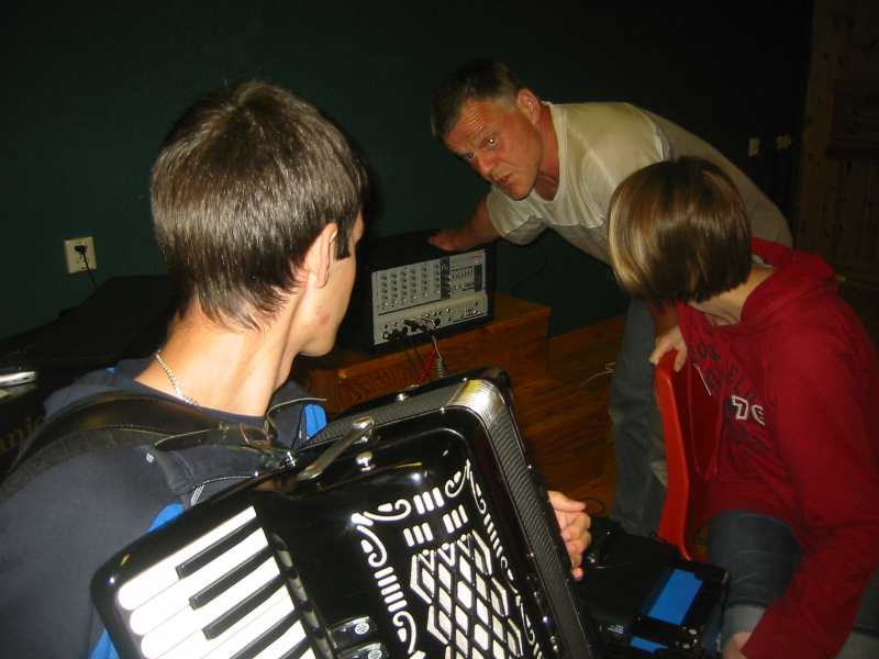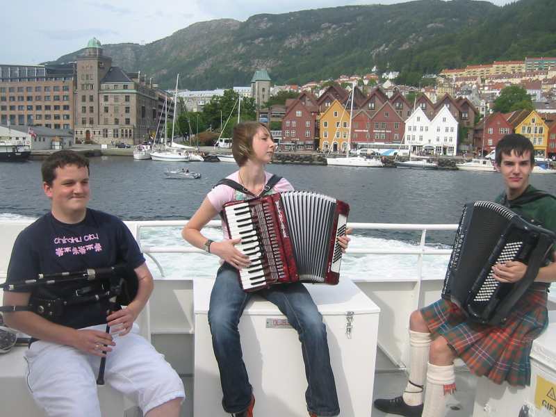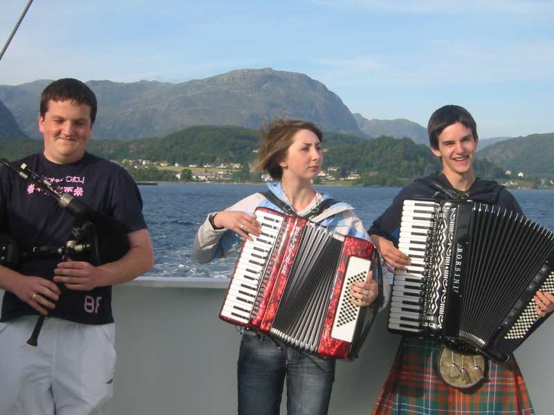 Struin med sekkepipe, Amy og Scott med trekkspel, spelte på ekspressen på vei til Nordsjøporthelga |