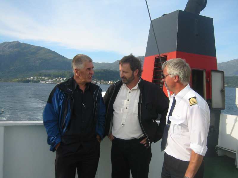 Peter Davidson og Per Arne Tveit diskuterer eit eller anna saman med ein av ferjemannskapet |