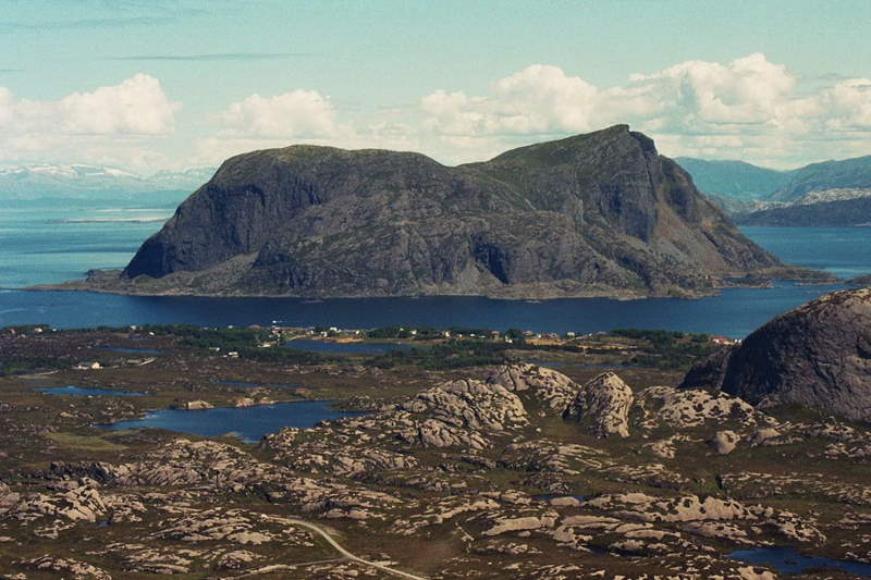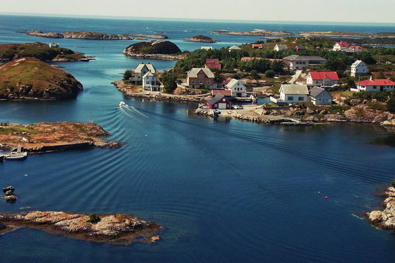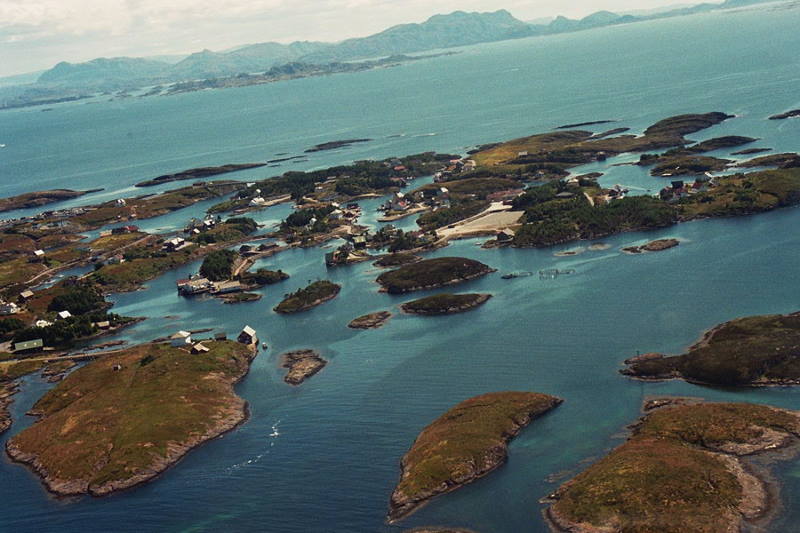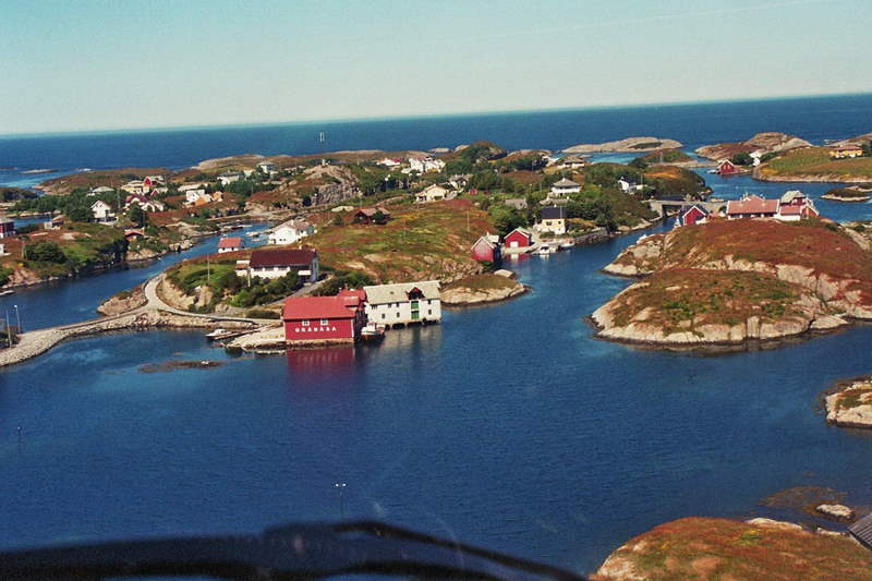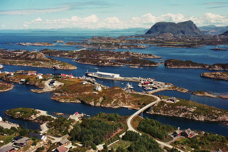 Bulandet frå aust, ein båt kjøyre under Langøybrua |