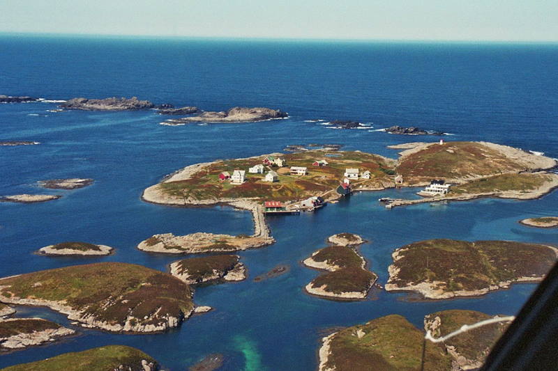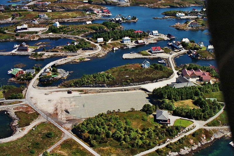 Sentrale delar Bulandet sett sørover, fotballbana midt i. |