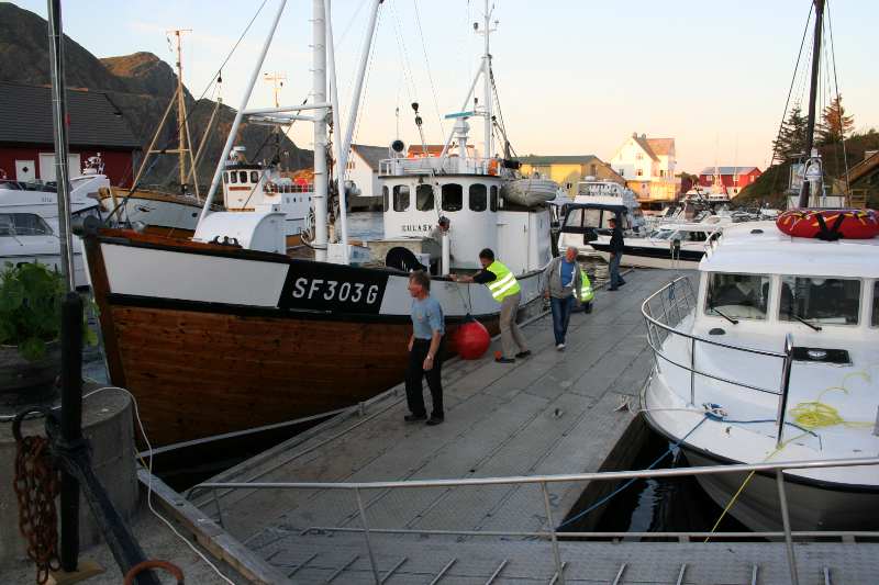 "Gulaskjer" kjem til kai på kveldstunda og får god hjelp frå Tor og dei andre vaktene |