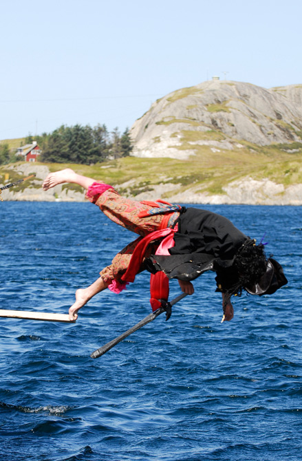 Så må sjørøveren teste ut fektekunnskapane, dei kunne nok vore bedre, men godt nok. Papagøya ser ut som ho har besvimt av beundring, eller so er da sjørøvaren som har pusta på ho |