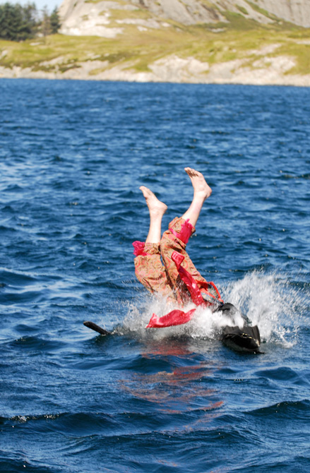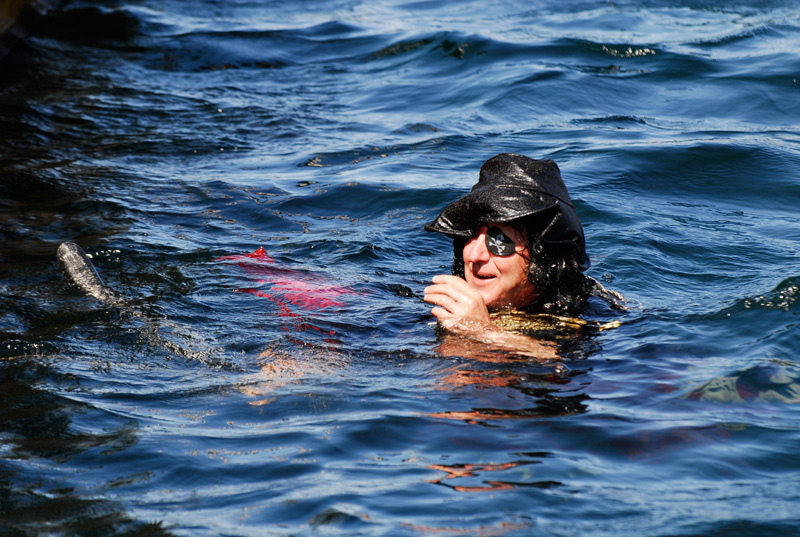 Sjørøvaren prøve å symje til land med verdigheit, sjølv om skjegget og mykje av da ellers skremmande utsjåande er forsvunne |