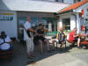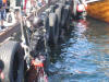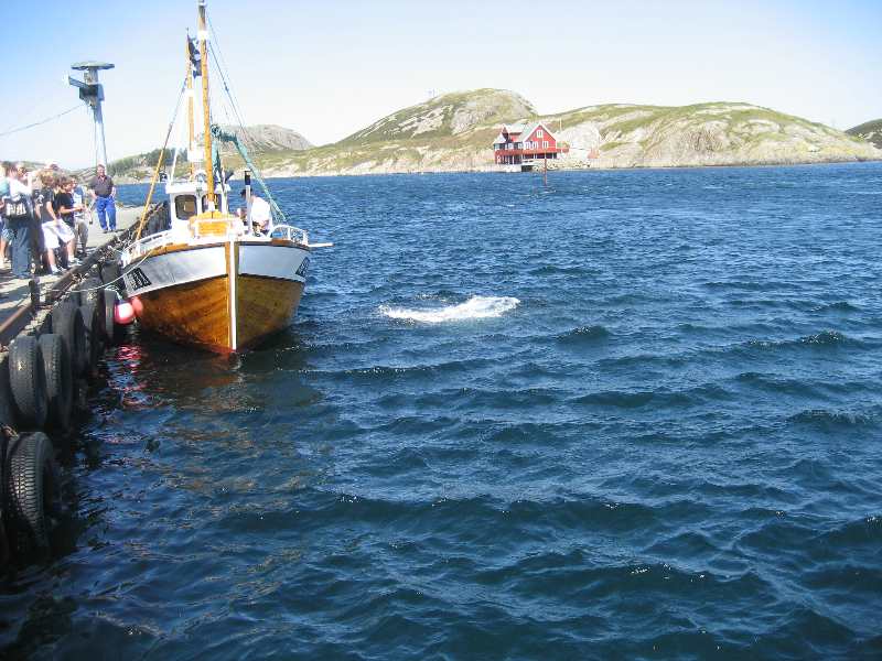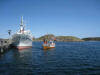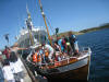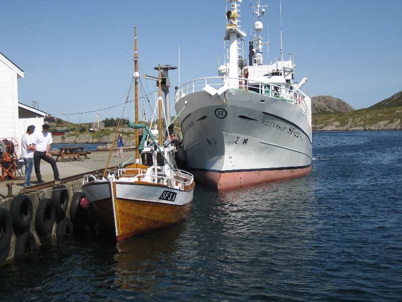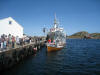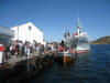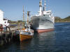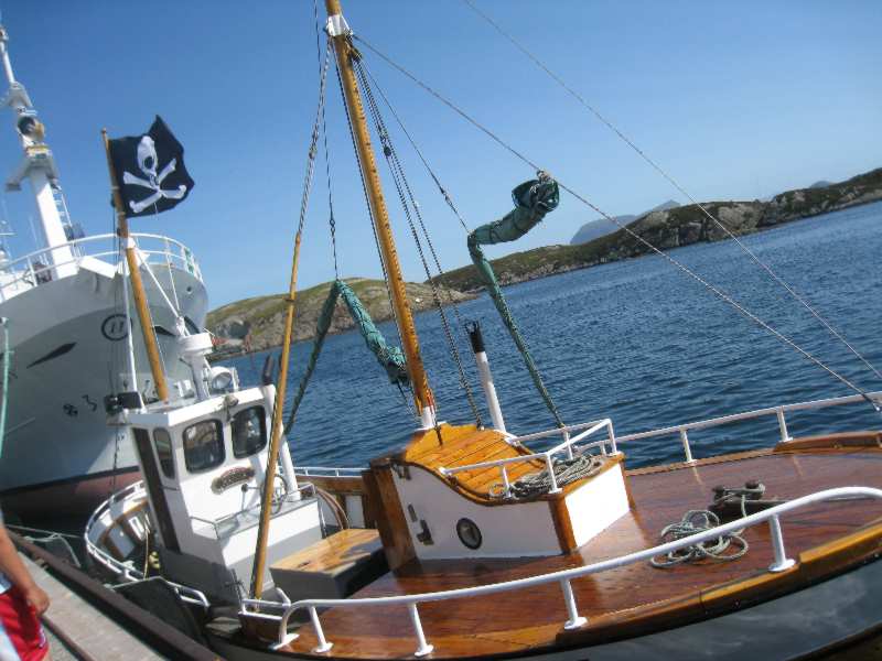 Sjørøverskøyta "Hanna den Henrivne" ved kai ved Jokerbutikken i Bulandet. Sjørøverskøyta nærmast kamera. |