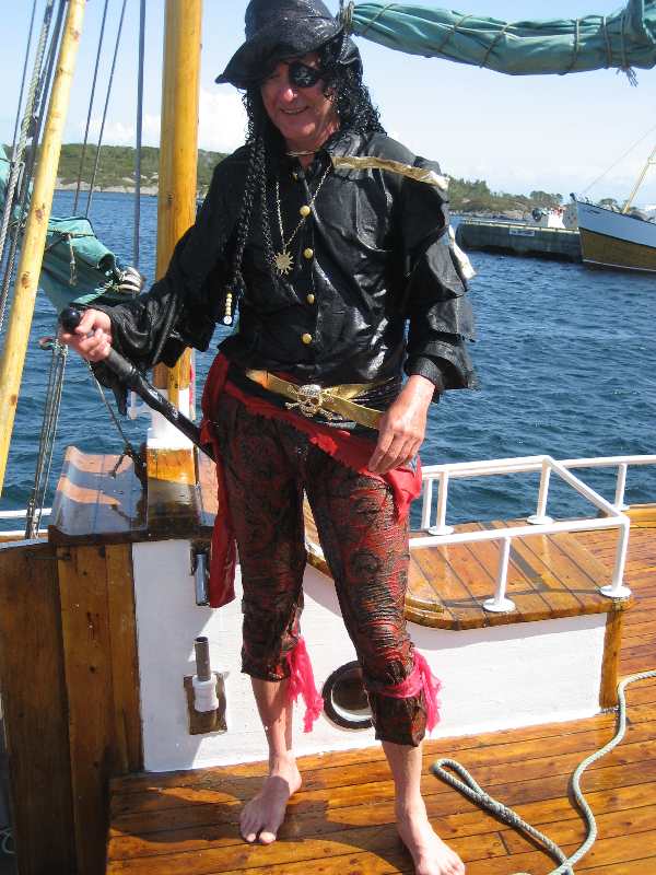 Ein våt, men smilande sjørøvar. Dog med eit skikkeligt krakilsk smil då, som fort kan utvikle seg til svartesinne vist han må gå fleire planka |