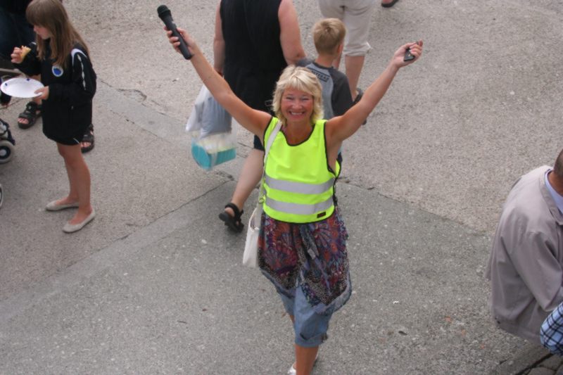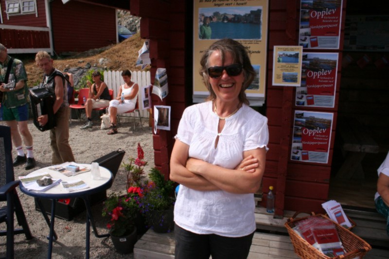Ruth Bakke er berre like smilande, blid og kjekk kvar gong heimesidefotografen treff på ho, enten er heimesidefotografen utsedvanlig heldig eller så er ho berre sånn. :-) Her er Ruth ved standen sin for turguiding på Værlandet og Bulandet |
