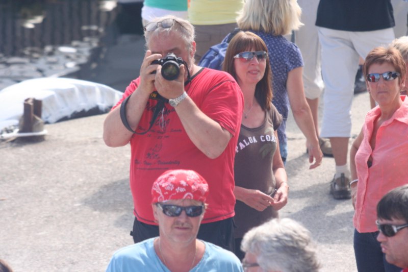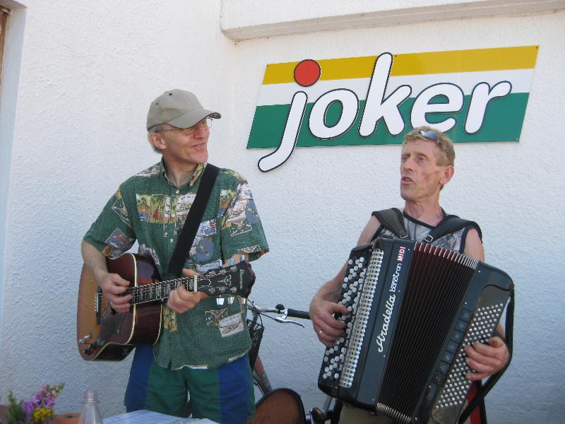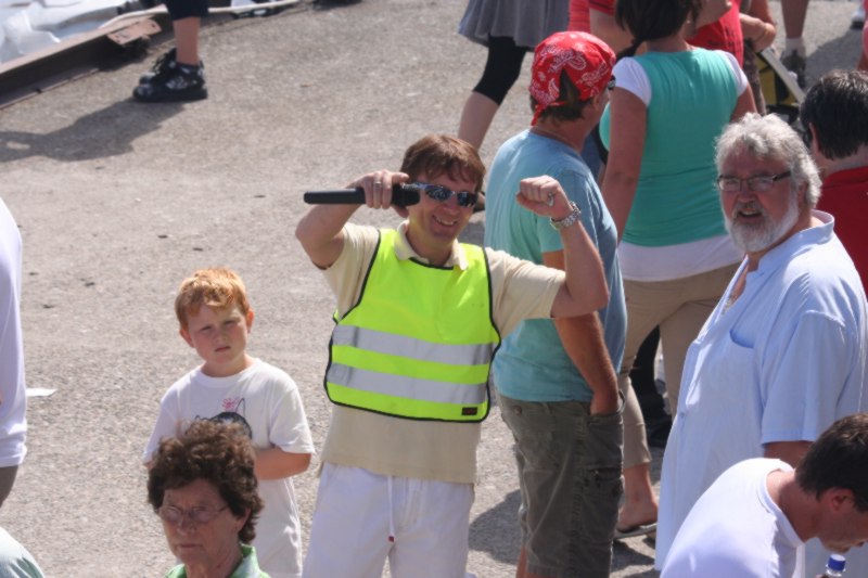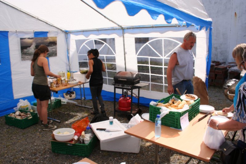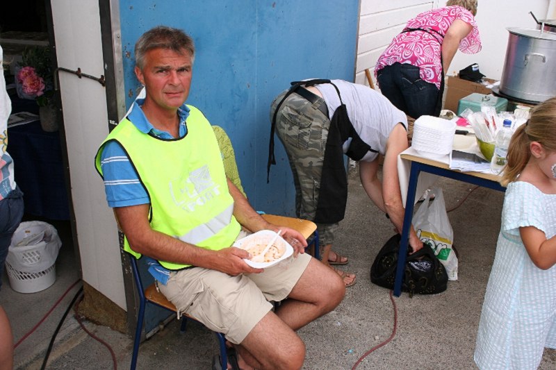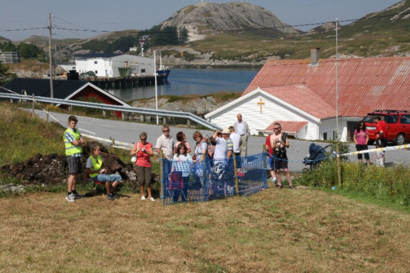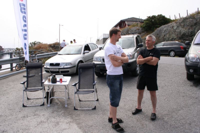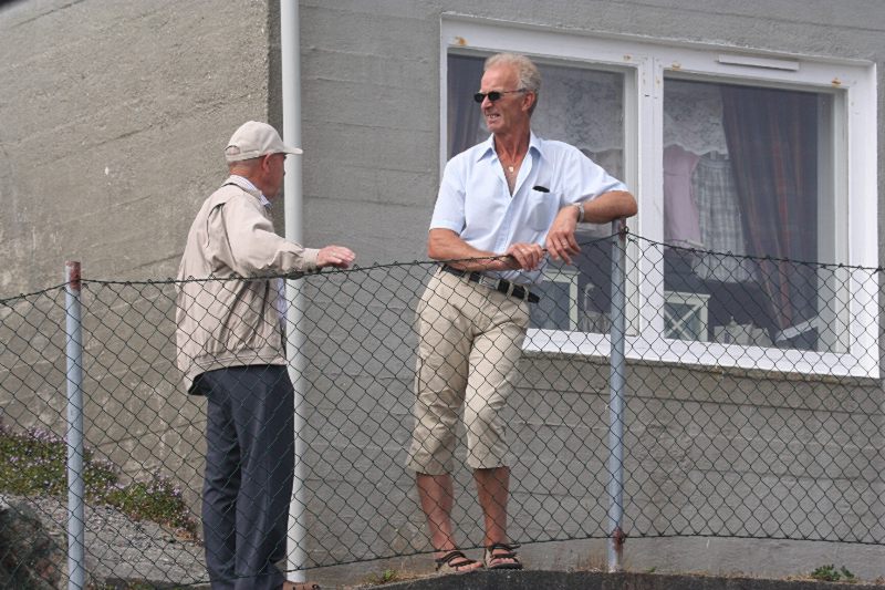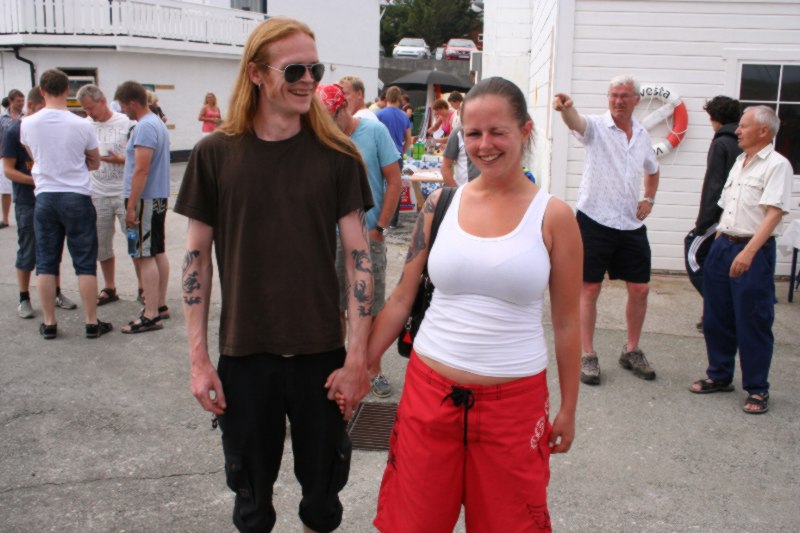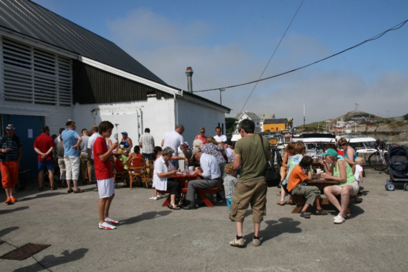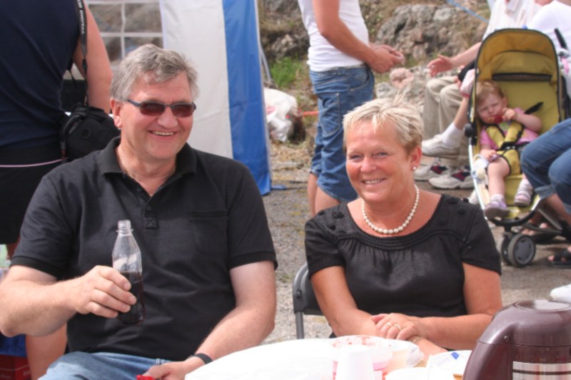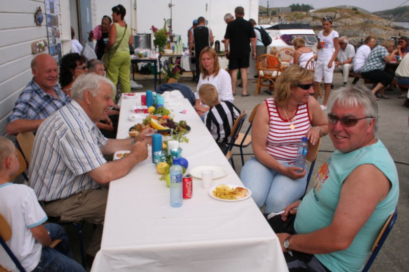Frank Hatlø, formannen i Bulandet Grendalag, er i stålande humør som vanlig, og er skikkeleg fornøgd med da fine veiret og alle gjestane som kosa seg. Så er han like blid sjølv om dinna hersens heimesidefotografen fer å snik rundt med fotografiapparet heile tida. Kjell er godt fornøgd med dagen han og. |
