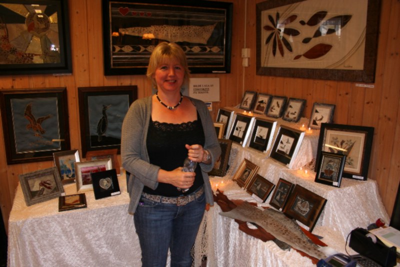 Vivian Vatnøy, like smilande og blid og fin som alltid, framfor standen sin. Ellers finn ein Vivian på Galleri Havblink. |