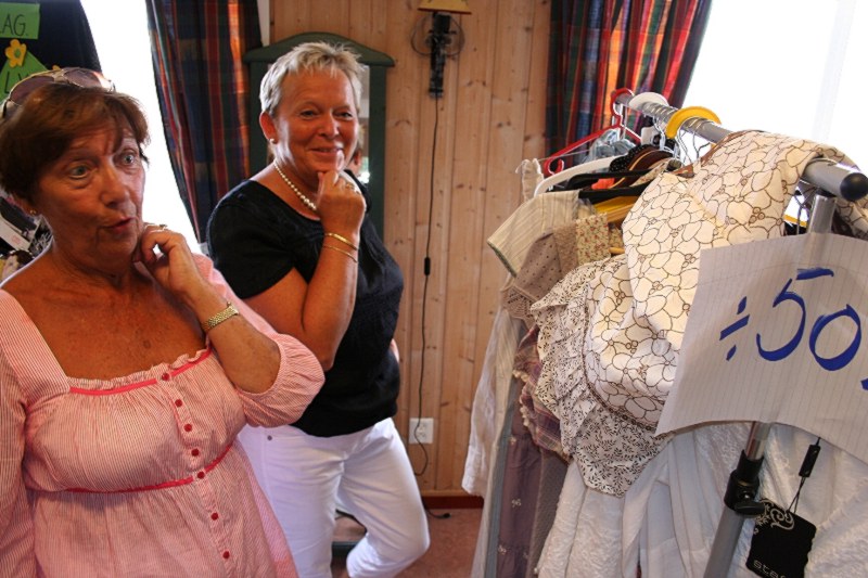 Aud Kari Steinsland, den flotte ordførerska vår, er ute på marknaden for å sjå om ho fin noko lurt å kjøpe. Her har ho nok funne ei interessant hylle, dama ved sidan av er i alle fall tydeleg imponert øve at alt ditta kan være minus 50 prosent. Heimesideskrivaren fekk ikkje med seg navnet på den imponerte dama, men da var ei alvorlig kjekk og hyggeleg dame. |