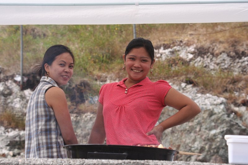 Like blide og smilande var Rachelie og Ving-ving seinare på dagen, her med Regina i midten. Ein måtte no berre kjøpe mat når ein ser slike flotte kjekke jenter som har laga den. |
