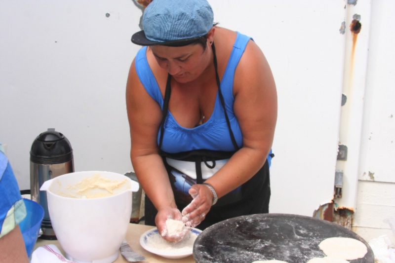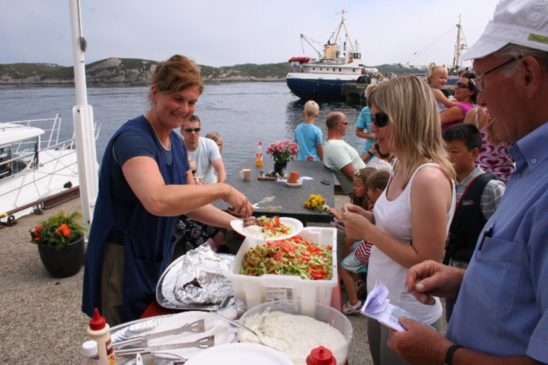 Da er tøft og slitsamt å være vakt, og då treng ein god mat. Her har Per Arild fått i seg ei delikatesse frå standen til Bulandet Fiskeindustri. Dei delikate rompene ved standen til Bulandet Fiskeindustri, er fyrst Ruth Sandøy og Irene Thistel Tysse. |
