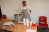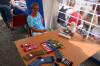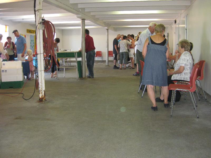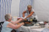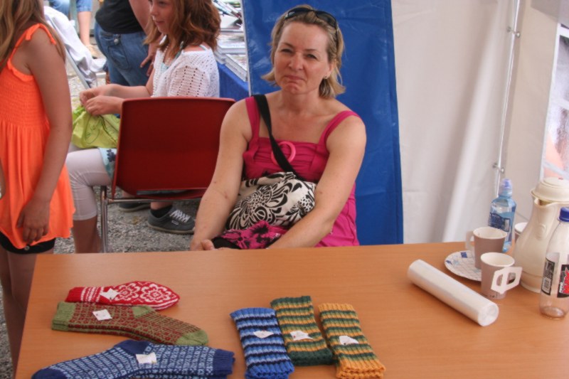 Nest yngste dotra til Solfrid, ho Anne Berit, har teke øve standen. Sjølv om da er hett og godt inne i telta, så ser ein at da har minka på sokka og votta sidan forrige bilde. Godt håndarbeid har folk vet på. Heimesidefotografen tok bilde av Anne Berit midt mylja to strålande vakre smil, uheldigvis knipsa han akkurat midt mylja smila. Men Anne Berit er no like vakker og flott uansett kor tid ho vert knipsa. |