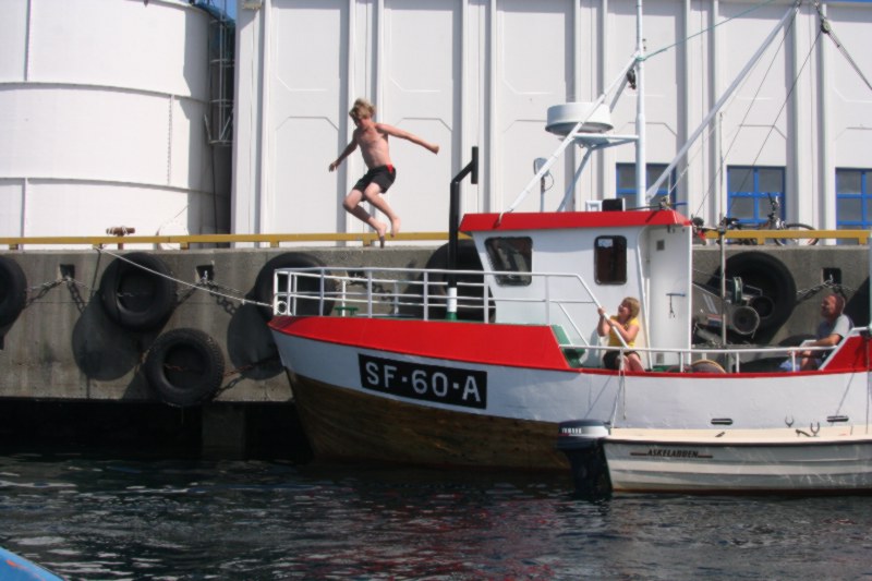 Da var hett og godt i lufta, men sjøen var nok litt for kald for heimesidefotografen. Andre brydde seg ikkje om temperaturen i hava, dei kasta seg uti i hytt og pine. |