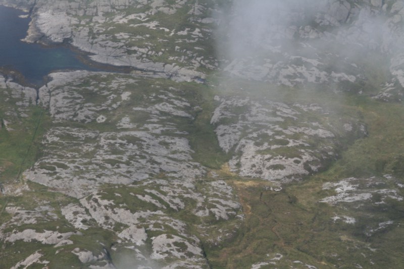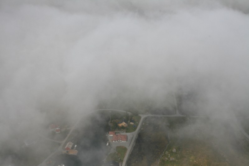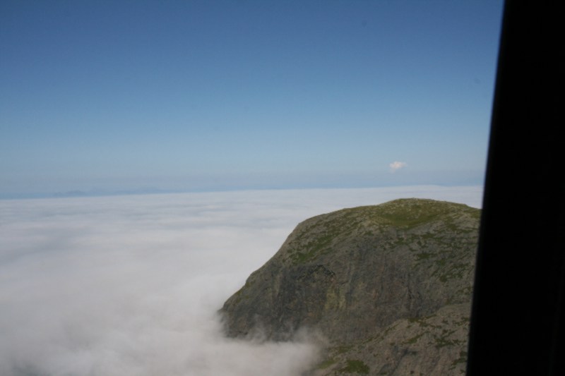 Helikopteret ventar litt med å ta ombord passasjerar til skodda har letta, mens trauste vakter passa på. Steffen, Bjørnar, Geir Inge, Tor Arin og ein som eg ikkje kjem på navnet på i farten. |