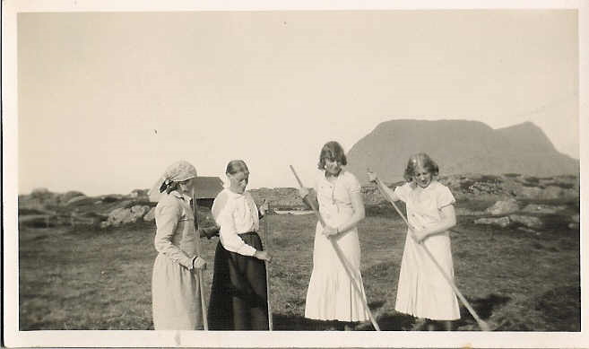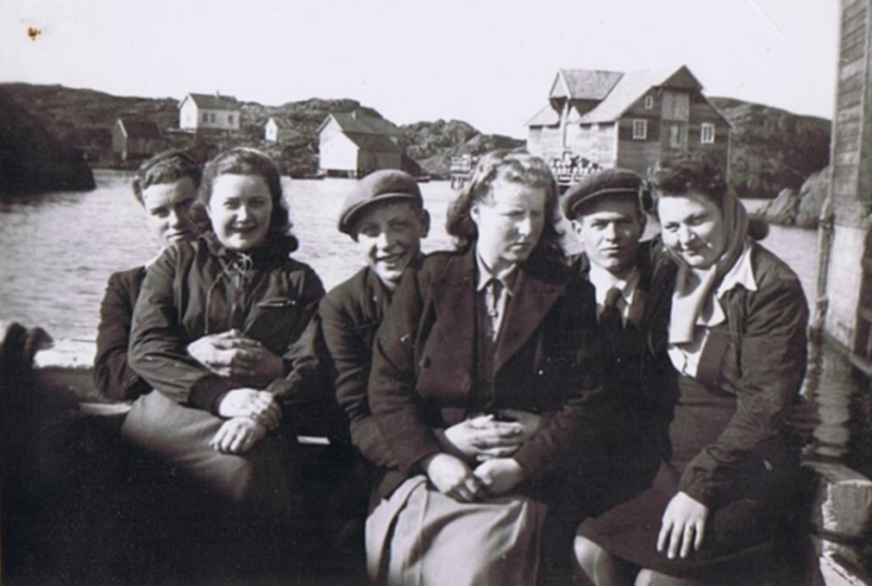 ![]() Eit bilde frå ca. 1946 /47. Frå venstre ser vi hunden Frøya, Anna Værøy, Signy Smelvær, Gunvor Værøy, Aud Leite og Dagfrid Leite. Bak ser vi gamle Vikahuset. |