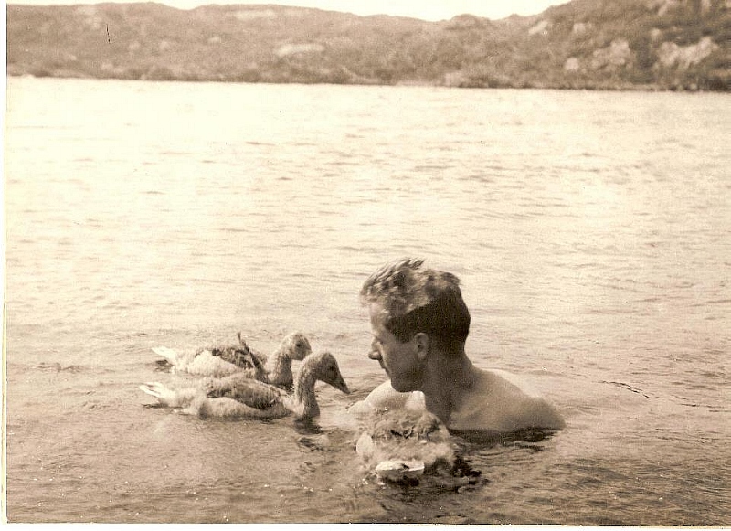 ![]() Eit kjekt bilde av Harald Leite og nokre gåsunger i Fadersvatnet. Her fortel Harald med eigne ord om tildragelsen: Eg trur det var 1958. Vi var i Håsteinen på taren. Det var i forbindelse med tørking at eg forkjorla ei grågås med eit stort kull. Eg trur eg kasta tare på henne der ho låg heilt kamuflert usynleg. Der vart eit forferdeleg spetakkel, ho for på sjøen og til havs med nokre og resten vart mine eller svartbaken sine. Eg jagde på svartbaken og plukka ongar i lomma, men kva skulle eg gjere med dei? Sleppte eg dei so sat stormåsen klar på hågen og strakte hals. Mora og dei andre ungane var borte so eg måtte ta dei med meg heim. Eg ol dei opp og dei heldt til på Værlandet, tre andre ville slo seg ilag med dei og vart like spake. Den eine måtte bøte med livet då ho vart gåsesteik. Det var ikkje alle som kunne sjå på desse vakre fuglane utan å ete dei. Om hausten for dei to gjenverande til syden saman med dei andre. I heile tre år etter kom dei og helste på meg på nordtur om våren. Fyrste året var dei saman med ein 8-10 andre som krinsa fleire turar rundt huset og heldt eit forferdeleg spetakkel, men dei landa ikkje. Dei andre åra fauk det berre lavt over huset og skreik ei helsing. So var det. |