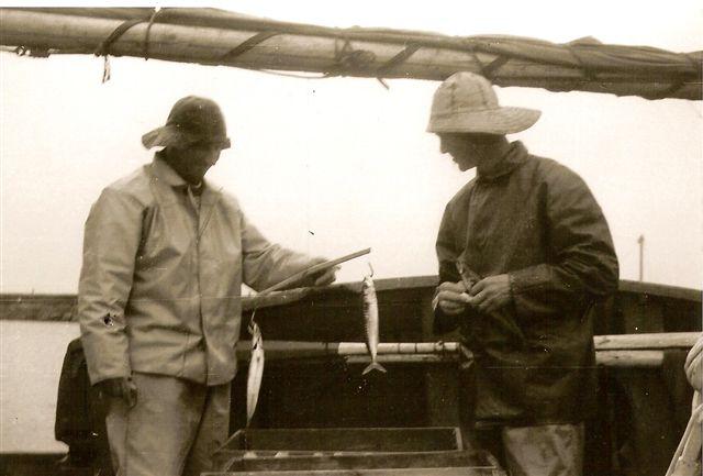 ![]() Harald Leite skriv: Her ser vi Tomas Leite i fiske på makrelldorging ombord i "Union". Vi var her to mann og hadde to dorger(regler) på kvar til saman 40 anglar. Tok makrellen godt kunne vi dra 500-1000 kg i timen alt etter størrelsen på makrellen. So var det då kor lenge makrellen fylgde med oss der vi draksa avgårde i 2-3 knops fart. Trefte vi stor fisk i lysninga og han fylgde oss i 4-5 timar hadde vi ikkje plass til meir og måtte gå til lands for leveranse. |