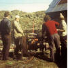![]() Nokre kara utfordra kvarande i å dra krok. Til venstre Per Nybø og til høgre Johan Hittun. I midten sit "Loppen" og ser på. "Loppen" som han blei kalla hette Ludvig til fornavn, vi veit ikkje etternavn, men da ordna seg sikkert. "Loppen" var den siste som budde i Gamlehuset i Hittun, som ein kan sjå under her. |