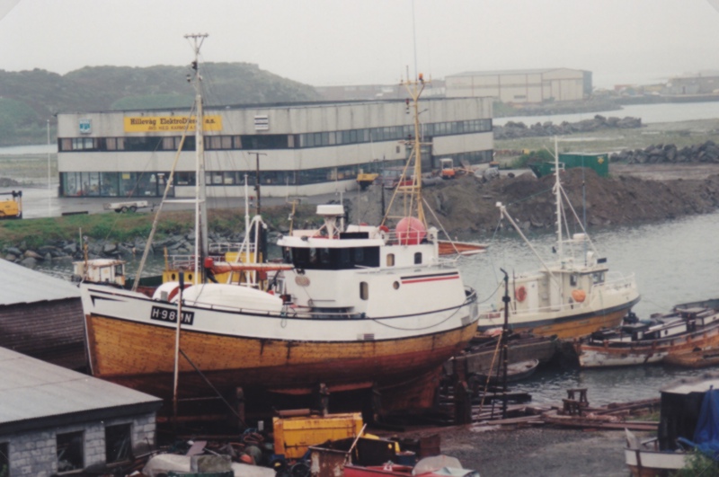 ![]() Harald Leite skriv: Her er slippinga av "Brasen" godt igong. Tre karar styrer med eit kvart nede på renna og vinsjen har stopp. Dei som styrer er frå venstre: Bodvar Værøy, Arne Blom og Karl Kjempenes. Oppe ved vinsjen ser vi frå venstre: Tormod Leite, Henrik Leite styrer viren, Arvid Værøy og Harald Leite var i sveiva. På andre sida av hamna ser vi Ragnar Melvær oppteken med og reperere eit gjerde. So hadde dei sauer fremdeles på nordre Vikajorda i 1977, då desse bileta var teke. |