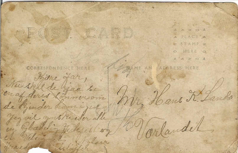 ![]() Bak på julekortet står det: Til Mr. Hans K. Lando, Værlandet. Kjære far, Nu skal de faa se en af deres sønner om de kjender ham igen. Jeg vil ynske eder alle en Glærdelig Julefest og et Velsignet nyttaar. Fra deres sønn Kristoffer."