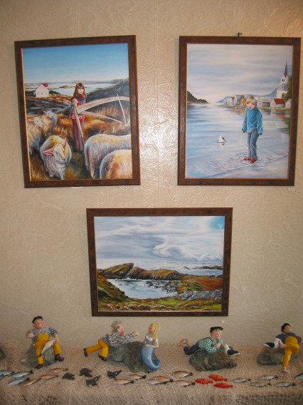 Fedøy i Bulandet. Utstillinga består av foto, maleri, trykk, smykker av glas, figurar og tekstilbileter med fiskeskinn. Kunstnarane som er utstilt er både lokale og meir perifere. No er da ikkje so at kunstnarane er utstilt då, men bileta deira kan du finne her. Dei lokale består av Vivian sjølv. Ho lagar tekstilbileter med fiskeskinn. Da spesielle her er at alt utanom bakgrunnen er laga av fiskeskinn. Lars Grepstad stiller ut foto. Både over og under vatn, og nord og sør for ekvator. Han har ei eiga heimeside som viser meir av bilda hans. Sjå linken ----> http://www.grepstad.no Kristin Nikøy stiller ut akrylmaleri og figurar ho lagar sjølv. Dei