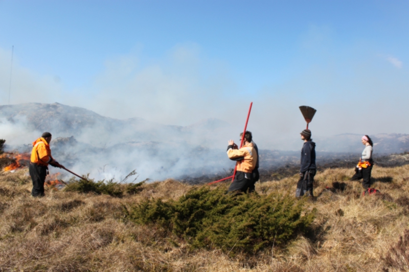 Slik ser kontrollert lyngbrenning ut, når pyrosjef Arve har fått både brann og hjelparar under kontroll. |