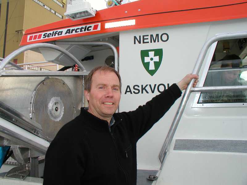 Jan Arild Landøy. Stolt skippar på Nemo. Gjennom ruta ser vi Arnt Bjarne som fekk lov til å vere med heilt til Trondheim for å hente nyebåten.