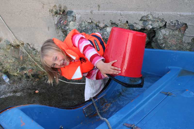 Emmy nyt livet med å tømme sjøen for vatn. |