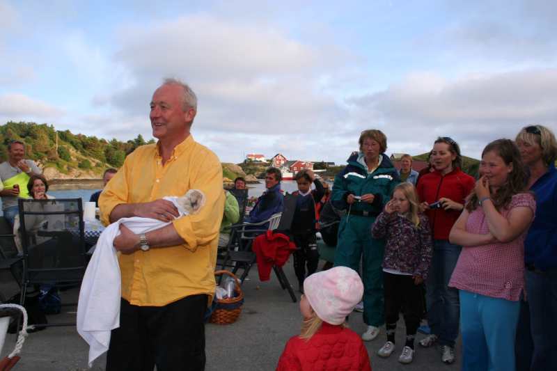 Jardar er prest for anledninga, den stolte "far" ber dåpsbarnet sjølv og faddera var da ikkje vanskeligt å få tak i. |