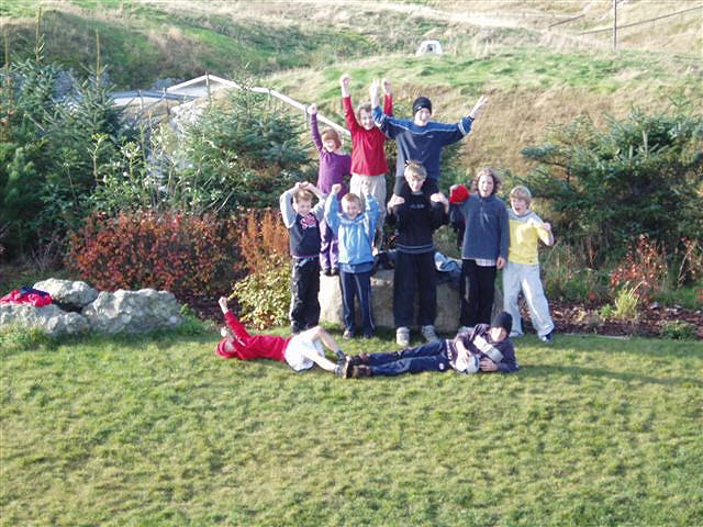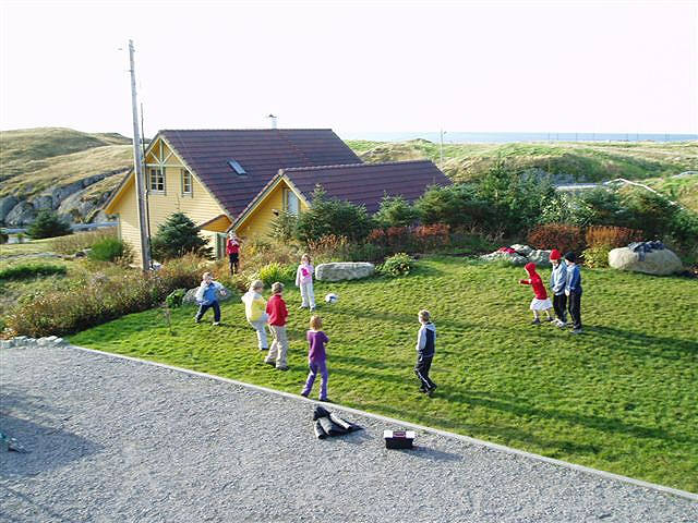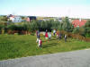 Anne Britt har sendt bilde frå Stormhåjin Stadion som befinn seg i hagen hennars.Nore målet er mellom eit dyrt maltraktert tre og ein pinne. |