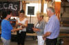 På andre sida av bordet er da ei like stor forsamling av prominente gjesta. Fra venstre Geir Randby, Nils A. Sandal, Dag Leite, Gry Leite og Linda Landøy. Bak står Janne og er imponert øve både kallen og resten av gjengen. |
