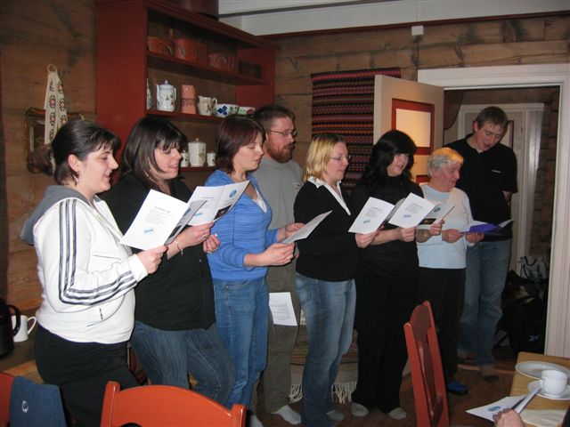 Koseleg samver i peisestova på jordbruksskulen. Fv Karine, Neil, Isabelle og Astri. |