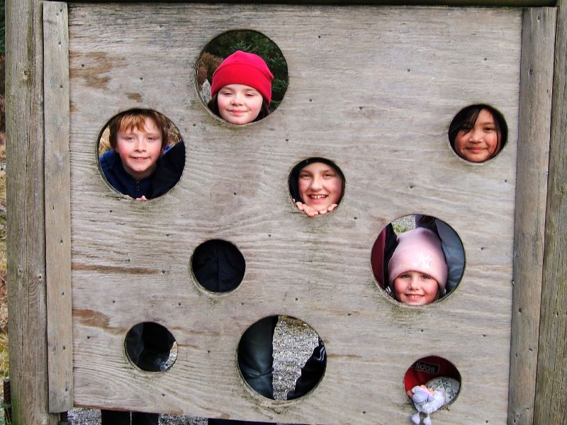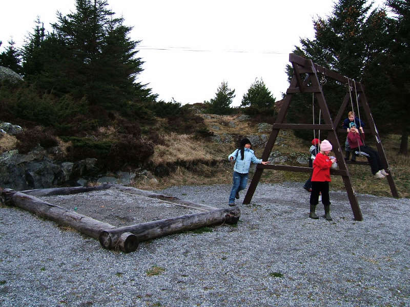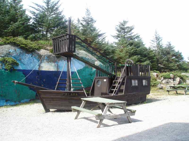 finst hinderløype, sjørøvarskute, sandkasse og disse og sklie. |