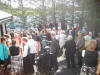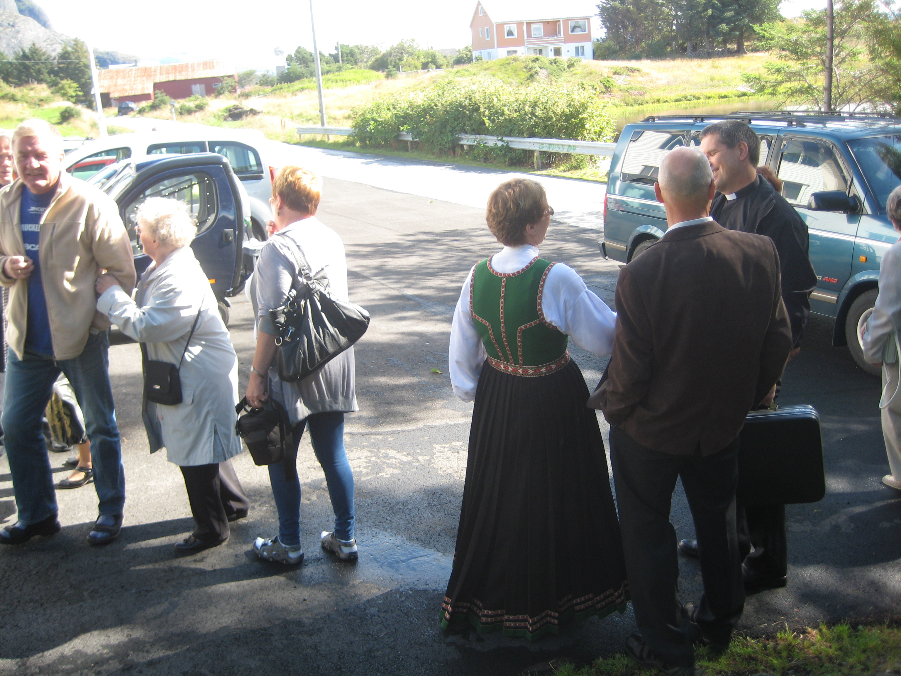 Bygdefolk og tilreisande samlar seg til gudsteneste. |
