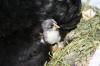 Den fyrste kyllingen kikka forundra ut i den nye verda. Foreløpig består verda hans av bakstussen på høna til Eva og kameralinsa til heimesideskrivaren, men han/ho såg ut til å være fornøgd med da. |