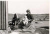 På Halsøyvågen. I båten Jofrid, Anbjørg og Sigrid Halsøy. På land set Leidulf Halsøy og beundrer damene. |