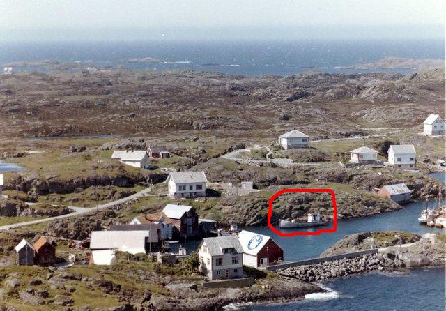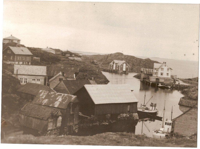 Flyfoto frå Værlandet 1961, «Alvhild» ligg ved «Dissberget» på vestsida av Værøyhavna. |