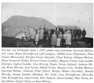Svar: Voldsomt tungvint. Vi måtte møte presis klokka 9 på skulen. Den låg midt på Værlandet. Ein kan endå sjå noko av murane etter det gamle skulehuset som var i bruk fram til 1961. (Den låg i det som no er hagen til Hjørdis og Arne Blom, red. anm.).